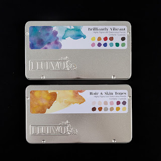 The card is a 7x7 easel card decorated in craft perfect Luna silver pearlecent card stock also Nuvo Water colour card and bright white craft perfect card the decorative paper is from my stash the topper was stamped with Tonic Studios black Hybrid ink and then gradually the colour built up and blended out with a water brush until I was happy with the results this image was coloured using the hair/ Skin tones sets of water colour pencils.